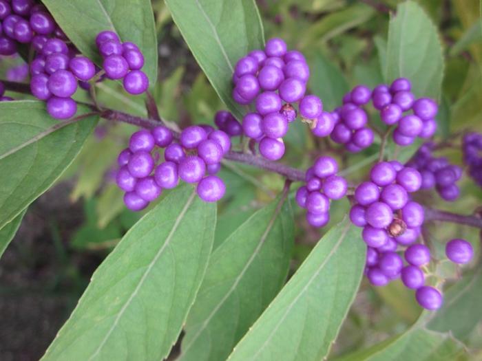 雨露がついた紫式部とヒラカンサス、ステキな写真ですね。きらきらと光っているように見えます。