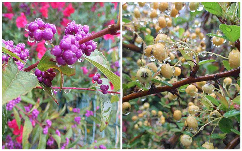 紫式部やヒラカンサスの雨の露、今日一日雨予報です