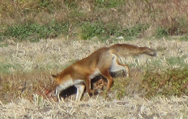 農道を散歩中{農道も舗装されてます}目の前をキツネが横切り遠くの畔へ、デジカメで撮ることができました。野生のキツネ初めて見ました。