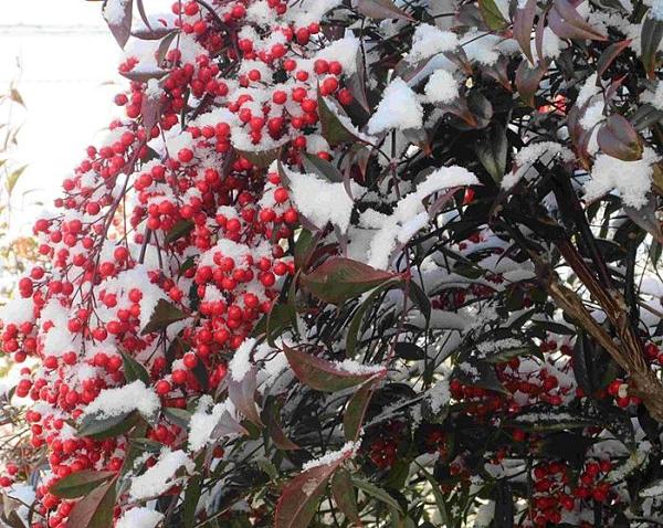 南天の実も雪が付き赤い実が綺麗です