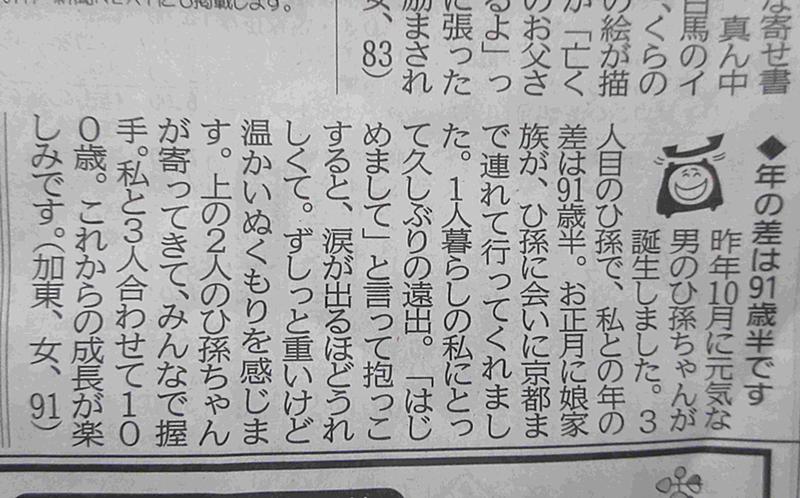 先日娘たちが曾孫ちゃんに逢いに連れてくれ嬉しくて神戸新聞「イイミミ」に投稿しました。