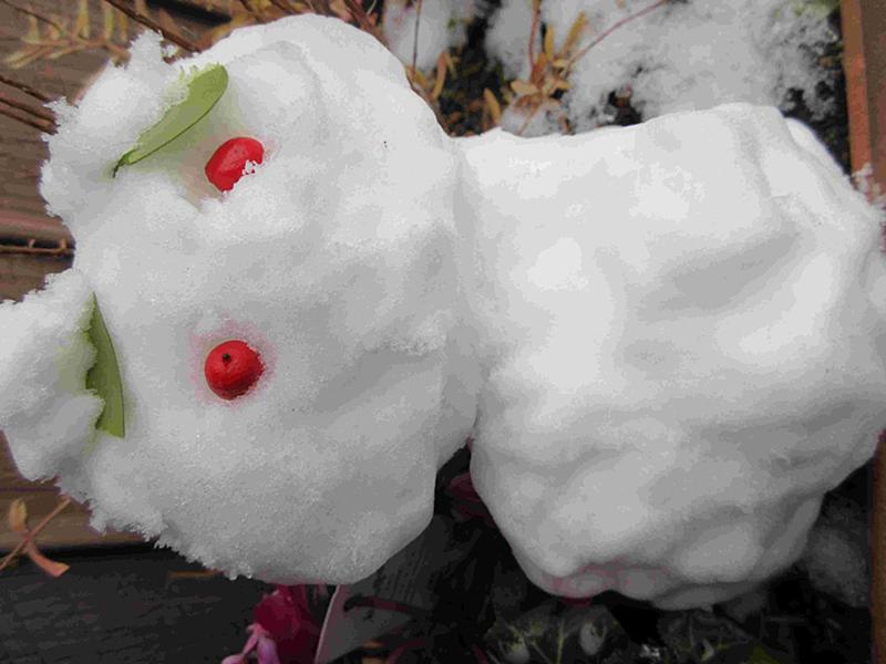 小さな雪だるまと思ったら南天の実を付けたらウサギになりました