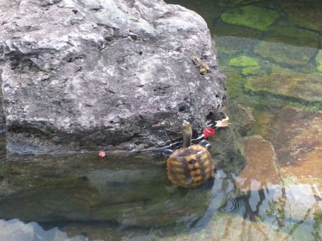 甲羅干し用に設置してもらった大きな石に、トノサマが上ってます。