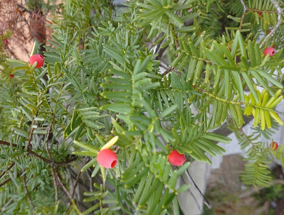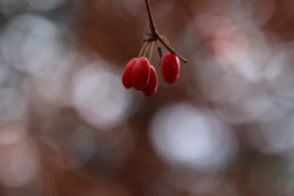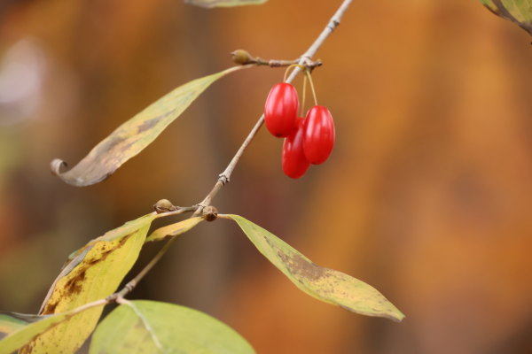 サンシュユの実と玉暈けです。